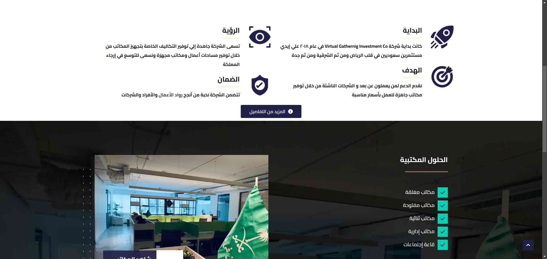 تأسست شركة Virtual Gathernig Investment Co السعودية في عام ٢٠١٨ في قلب الرياض وهي تهدف إلي دعم الشركات الناشئة و الأفراد الذين يعملون عن بعد من خلال توفير مساحات الأعمال والمكاتب المجهزة بأسعار مناسبة مما يساهم في توفير التكاليف وزيادة الإنتاجية ومن بعد النجاح الذي حققته الشركة في الرياض بدأت رحلتها في التوسع للشرقية ومن ثم جدة وتستمر رحلتنا ولن تتوقف..